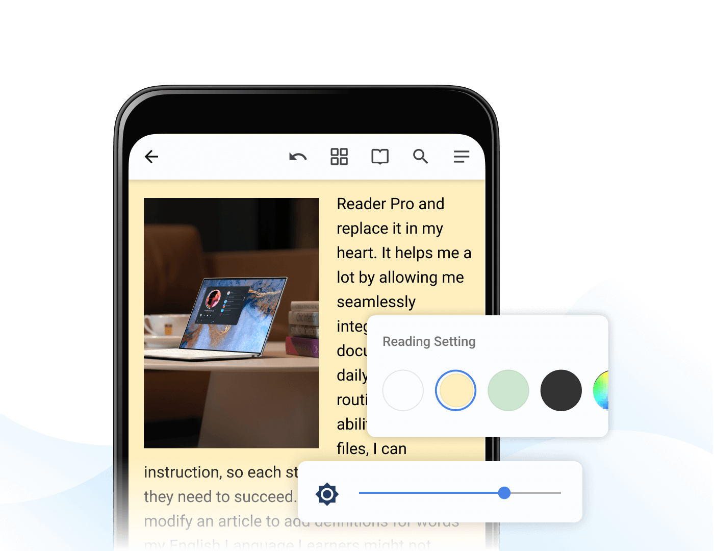 PDF Reader Pro Android with fast PDF viewing rendering engine provides smooth viewing experience. You can adjust theme colors, brightness, scrolling orientation, full-screen mode and more to enjoy the best reading experience on the go.