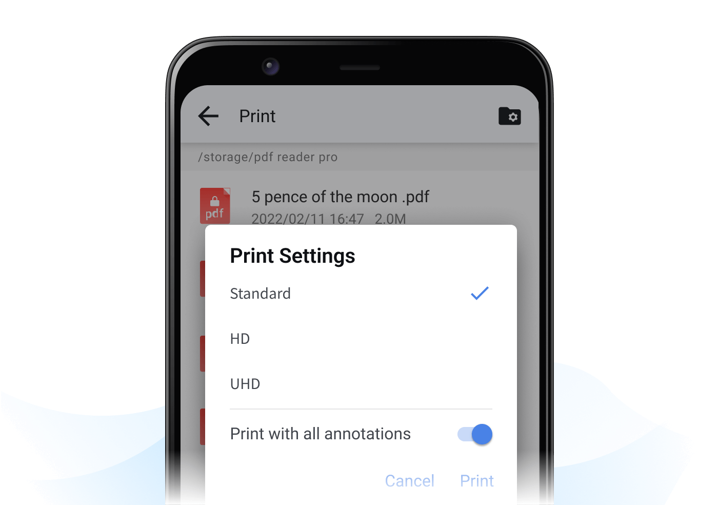 No need for a computer. PDF Reader Pro enables you to print PDF files on Android phones or tablets and promises the best quality. You can also print a PDF along with the annotations.