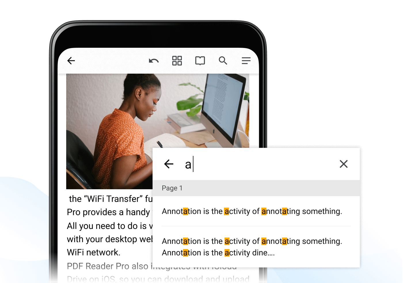 PDF Reader Pro comes with many helpful ways to navigate within your PDF. Search for particular words or phrases inside the PDF and get to where you want in a snap or jump directly to a specific page. Additionally, PDF Reader Pro remembers files you already worked on, and the positions you left them last time.