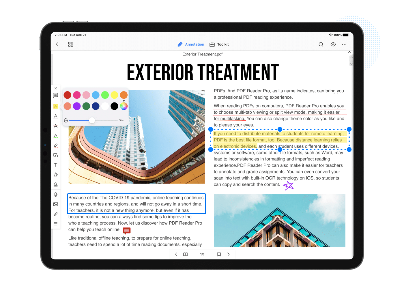 PDF Reader Pro offers a number of options for annotating your PDF documents efficiently. Highlight and markup texts and draw while you are reading books. This is the most natural way to remember important things.