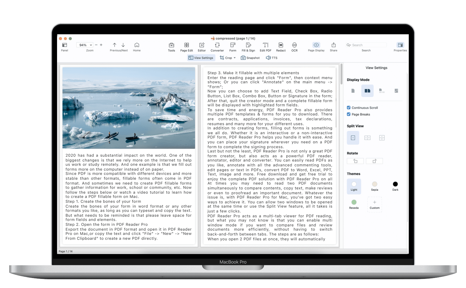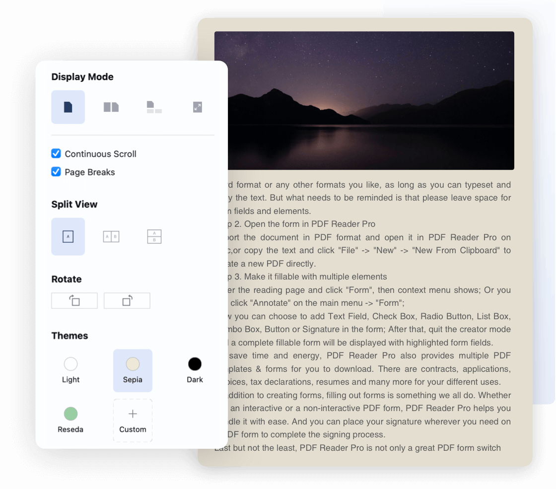 Enjoy the user-friendly setting. The switchover from bright white to the dark mode is helpful to protect your eyes when you read at night. Changing the background colors as you want enables you to customize your own PDF Viewer Mac. Outlines and bookmarks make your PDF files convenient to search and read.