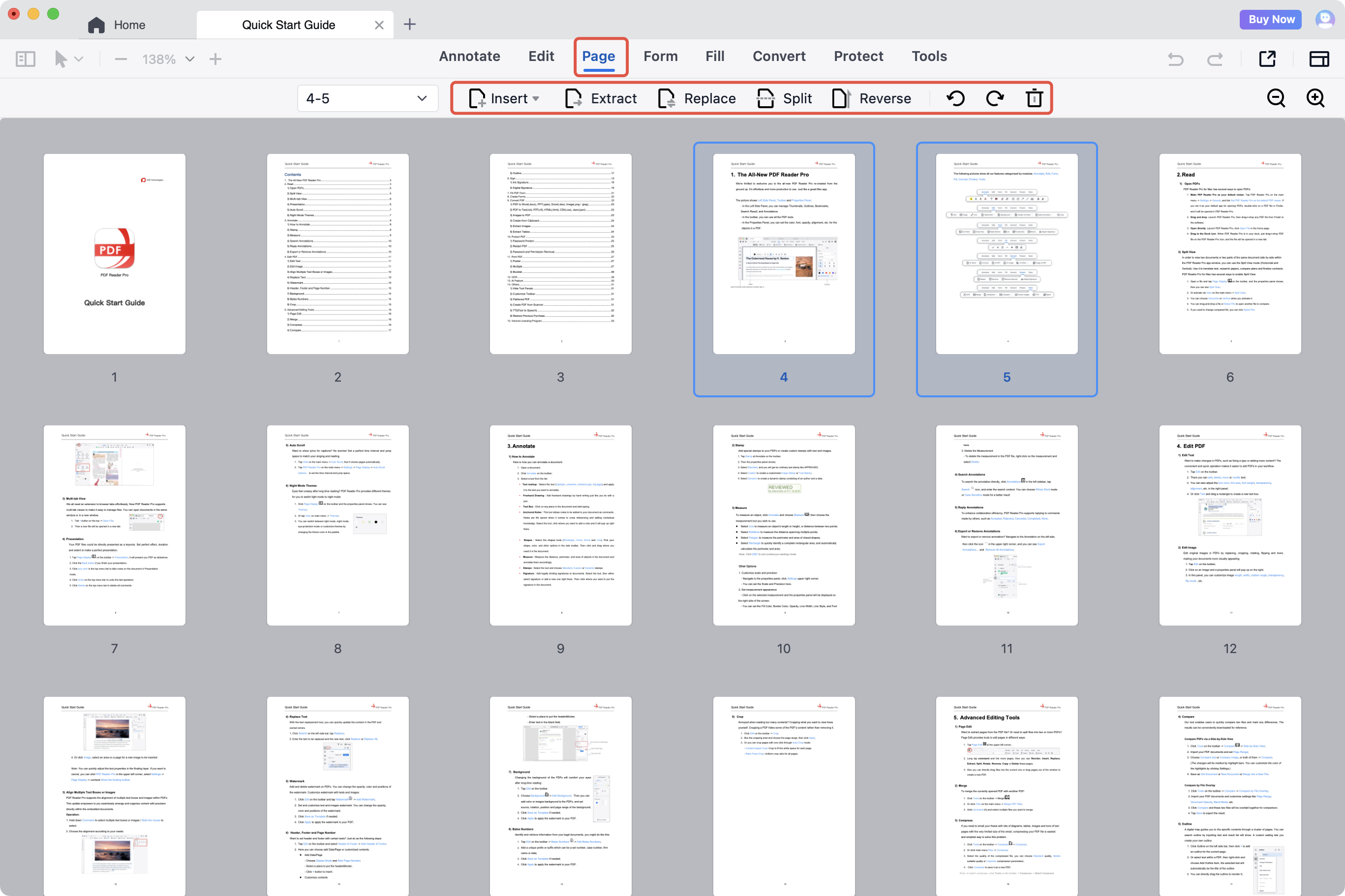 3. Then you can edit the selected PDF pages, such as Insert, Extract, Replace, Split, Reverse, Rotate,and Delete PDFs. You can also drag pages to reorder or to create a new PDF document;