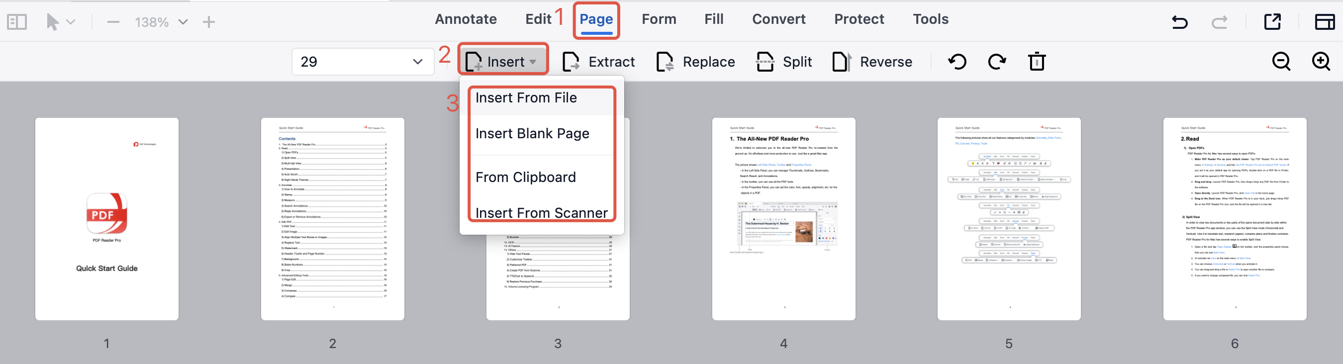 Inserting pages allows you to add new content to an existing PDF, whether from another file, a blank page, your clipboard, or a scanner. Follow the steps below to insert pages in PDF Reader Pro.