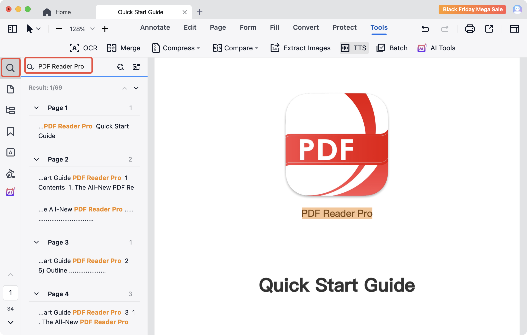 When reading a large PDF file, you may need to use page navigation tools to jump to specific pages so that you can find useful messages quickly. PDF Reader Pro has a variety of methods that can be used to navigate PDF documents.