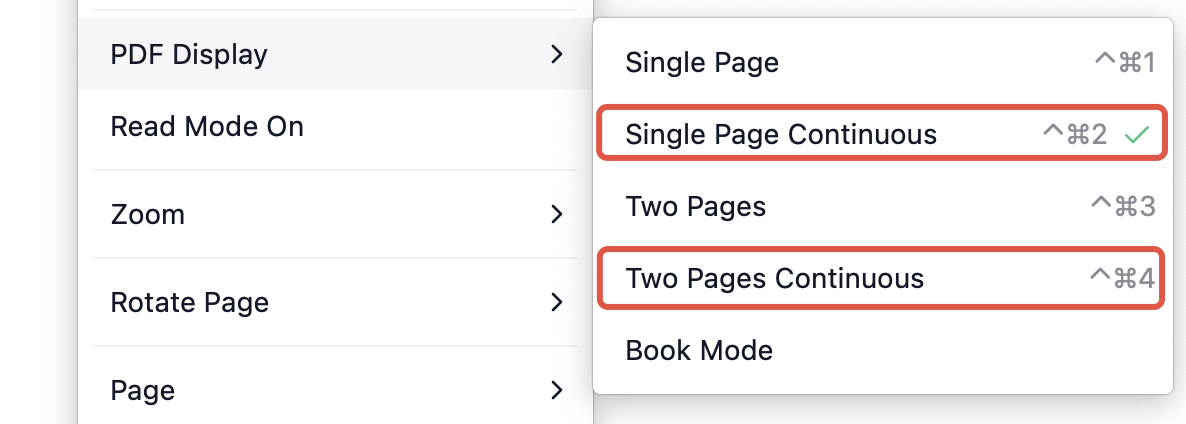 2. Choose PDF Display -> Single Page Continuous or Two Pages Continuous.