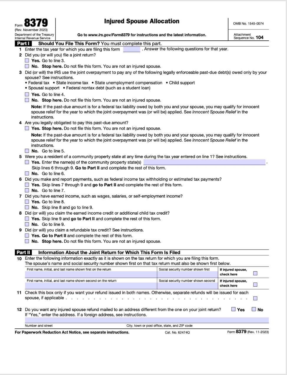 The "injured" spouse on a jointly-filed tax return can file Form 8379 to regain their share of a joint refund that was seized to pay a past-due obligation of the other spouse. These obligations might include past-due federal tax, state tax, child support, or federal non-tax debt (such as a student loan). The term "injured" refers to the negatively impacted spouse, who does not owe the debt.