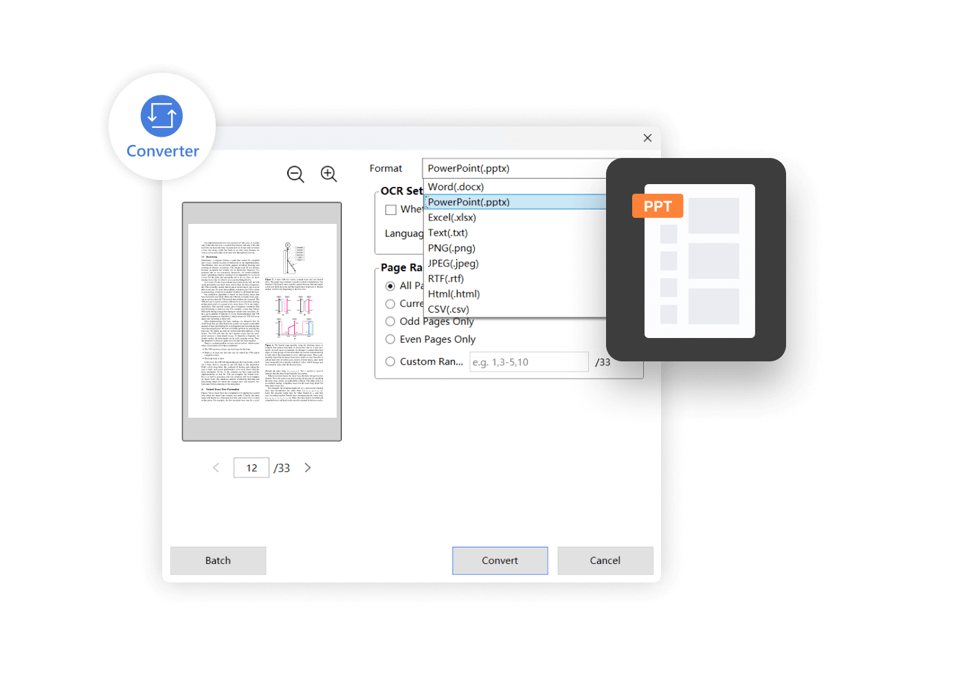 Use PDF Reader Pro to convert PDFs to PPT in a heartbeat. The output PowerPoint presentation will retain its original formatting, for you to revise and edit.