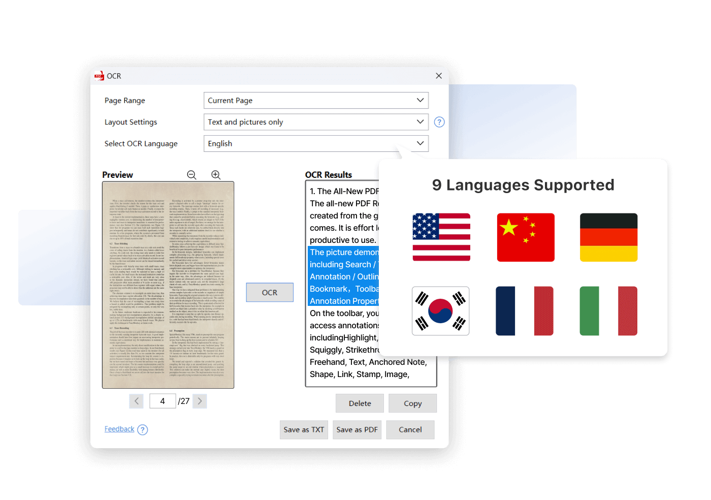 PDF Reader Pro’s OCR technology recognizes multiple major languages within text, such as English, Chinese, French, German, Japanese, Korean, and more.