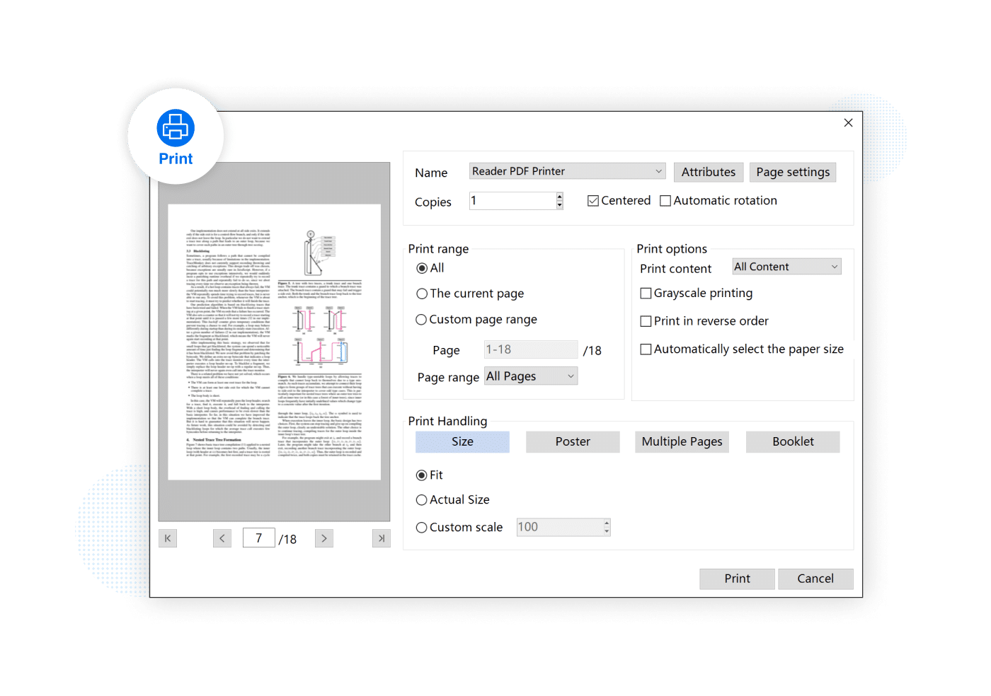 Printing is one of the most commonly used operations in office, PDF Reader Pro Windows makes it easier, in just one click. Set your preferred page size, orientation, number of pages and start saving time.