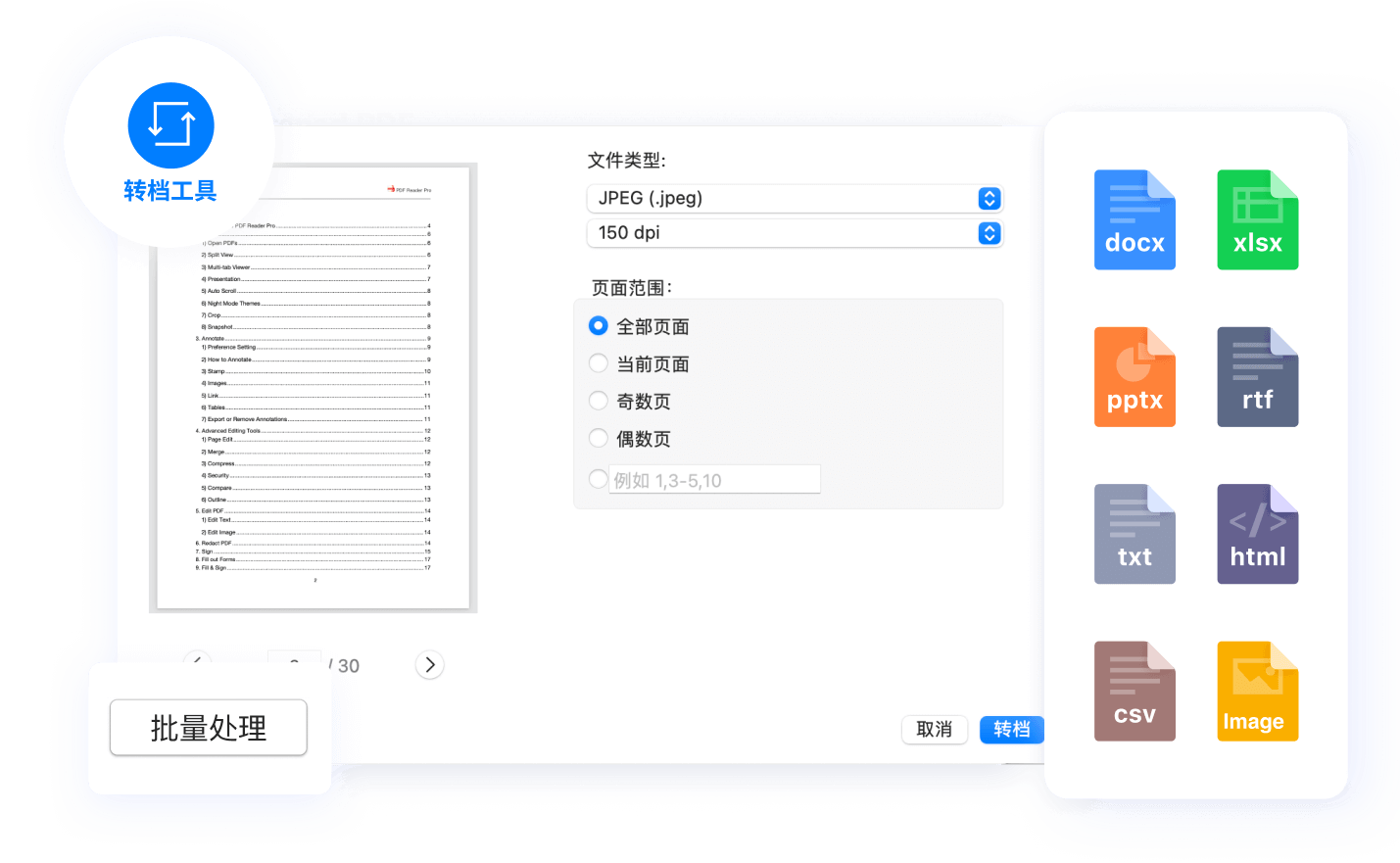 使用 PDF Reader Pro 将大量纸质文件转换为电子文档。扫描商业书籍并将其转换为可搜索的 PDF 文件,或将 PDF 转换为 Word、Excel 和 PowerPoint 等格式。