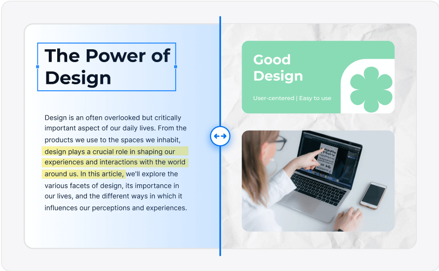 编辑PDF中的图片以获得更好的页面布局。一键新增,裁剪,替换,旋转,放大缩小,或移动图片。