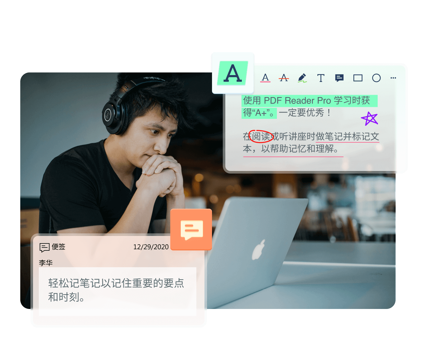 学生进行无纸化学习,记笔记、注释和编辑 PDF 中的文本。