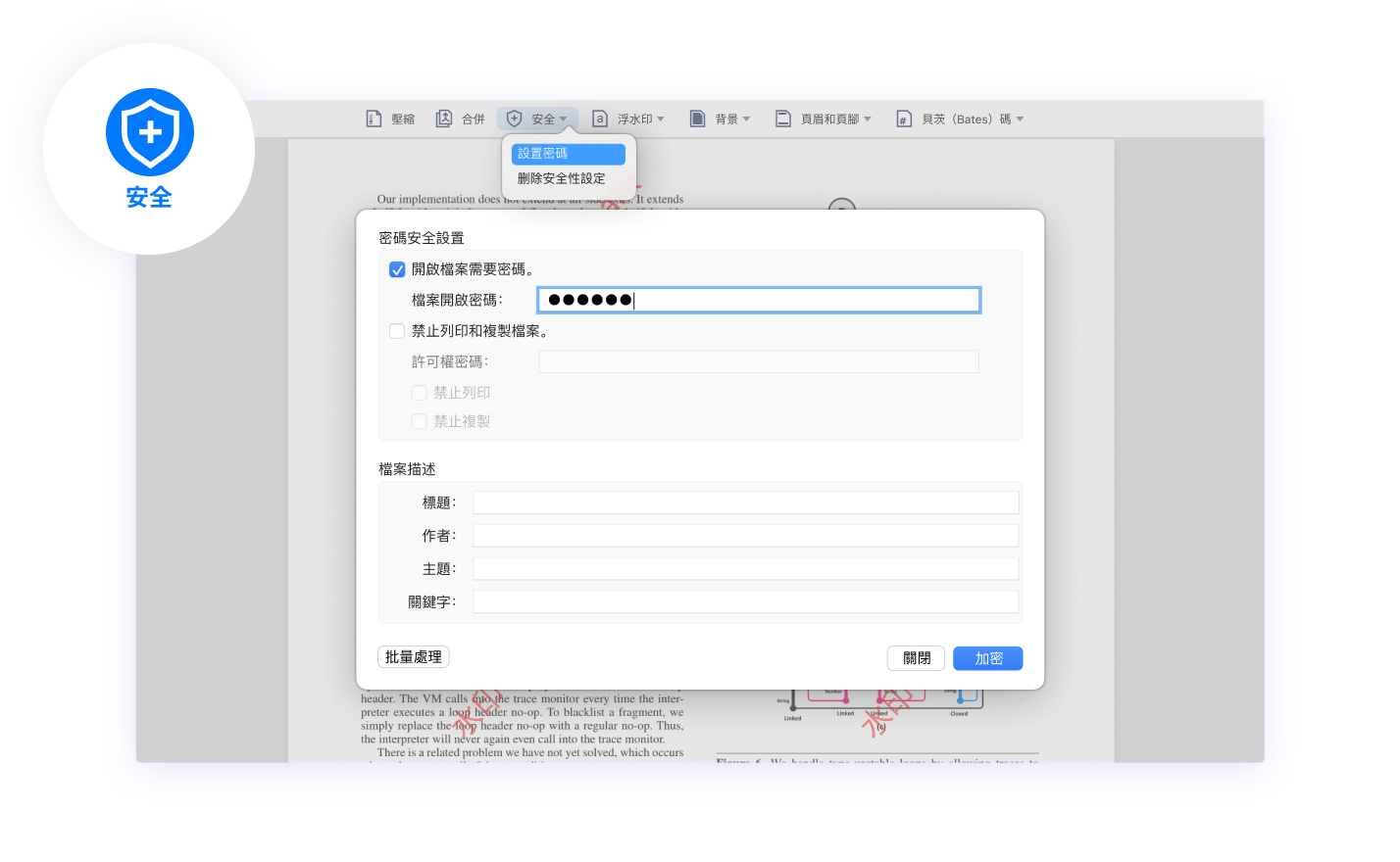 PDF Reader Pro 幫助您透過密碼保護以及防止未經授權檔案被讀取。並添加浮水印以防止您的PDF設計檔被盜用,確保資料傳遞中的安全。