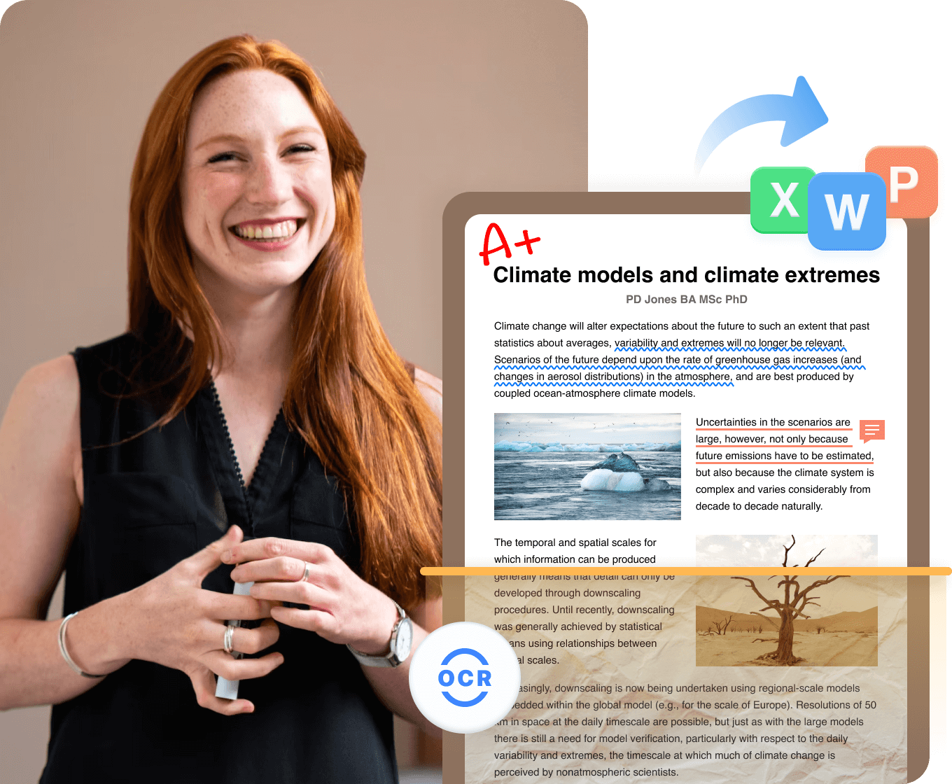 使用 OCR 將PDF檔轉換為可編輯的文字檔案或可搜尋的 PDF。啟用文字擷取、編輯和整合到教學素材中。