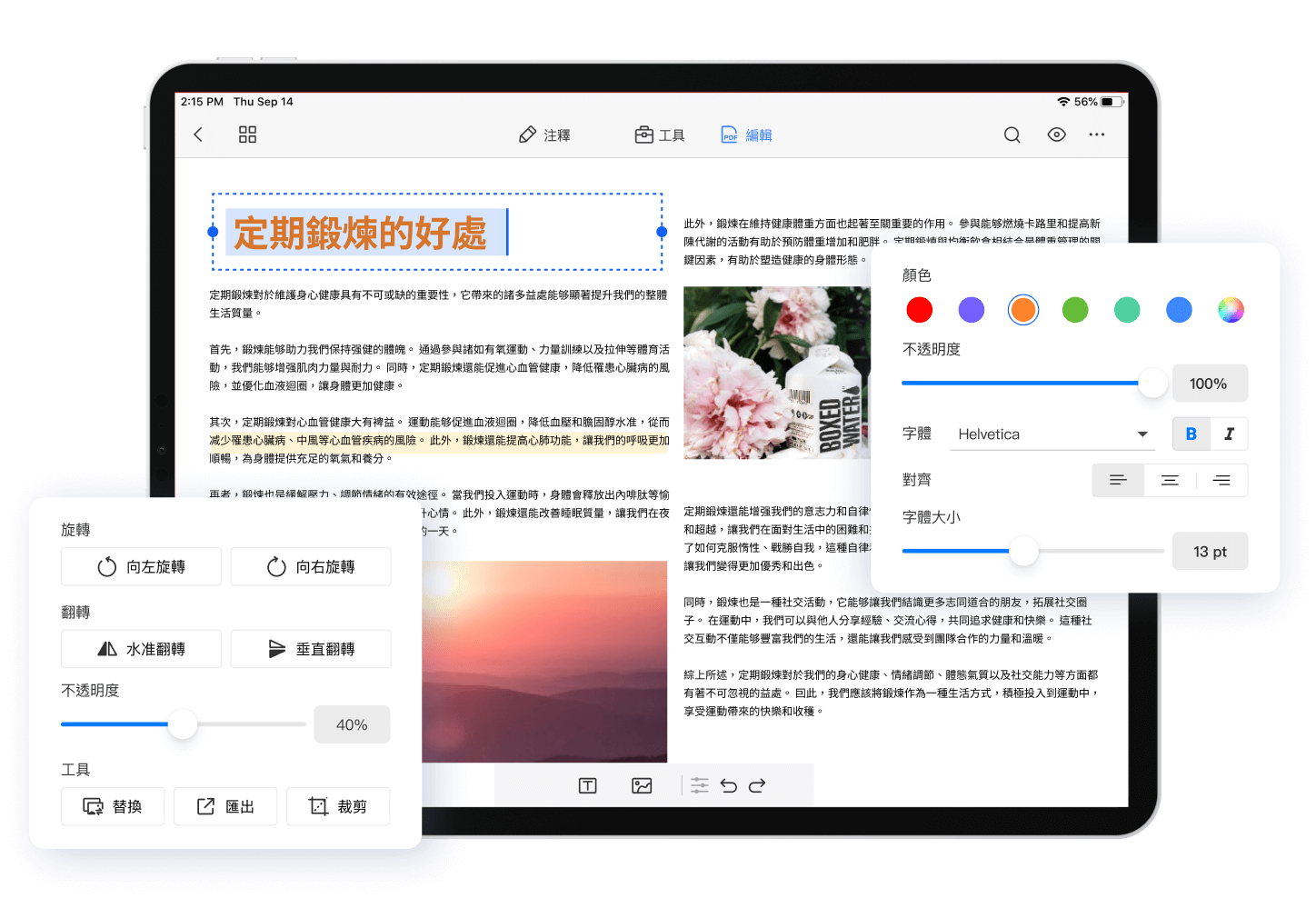 強大的編輯工具可輕鬆精確修改內容。 您可以根據需求新增、編輯和刪除內容,或透過裁切、旋轉、替換等方式修改原始圖片,或變更文字的字體、大小和顏色。