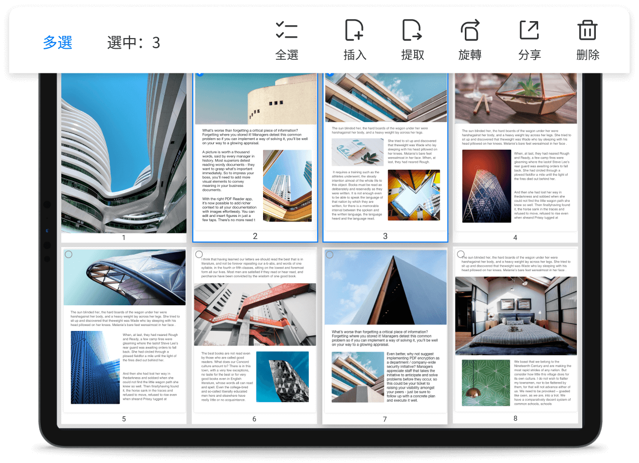 使用各種頁面管理工具處理PDF文件, 包含重新排列、插入、提取、旋轉、刪除、共用頁面或將多個 PDF 文件合併為一個。