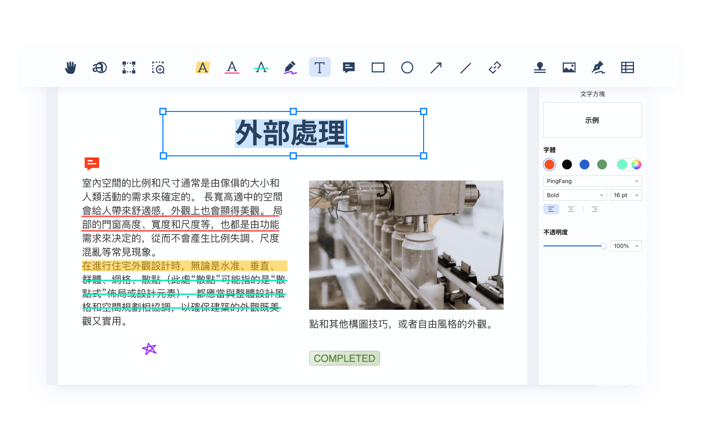 在會議中,您可以使用PDF Reader Pro對工廠圖紙進行註解,例如高光標記、繪圖等,確保沒有遺漏的事項或數據。